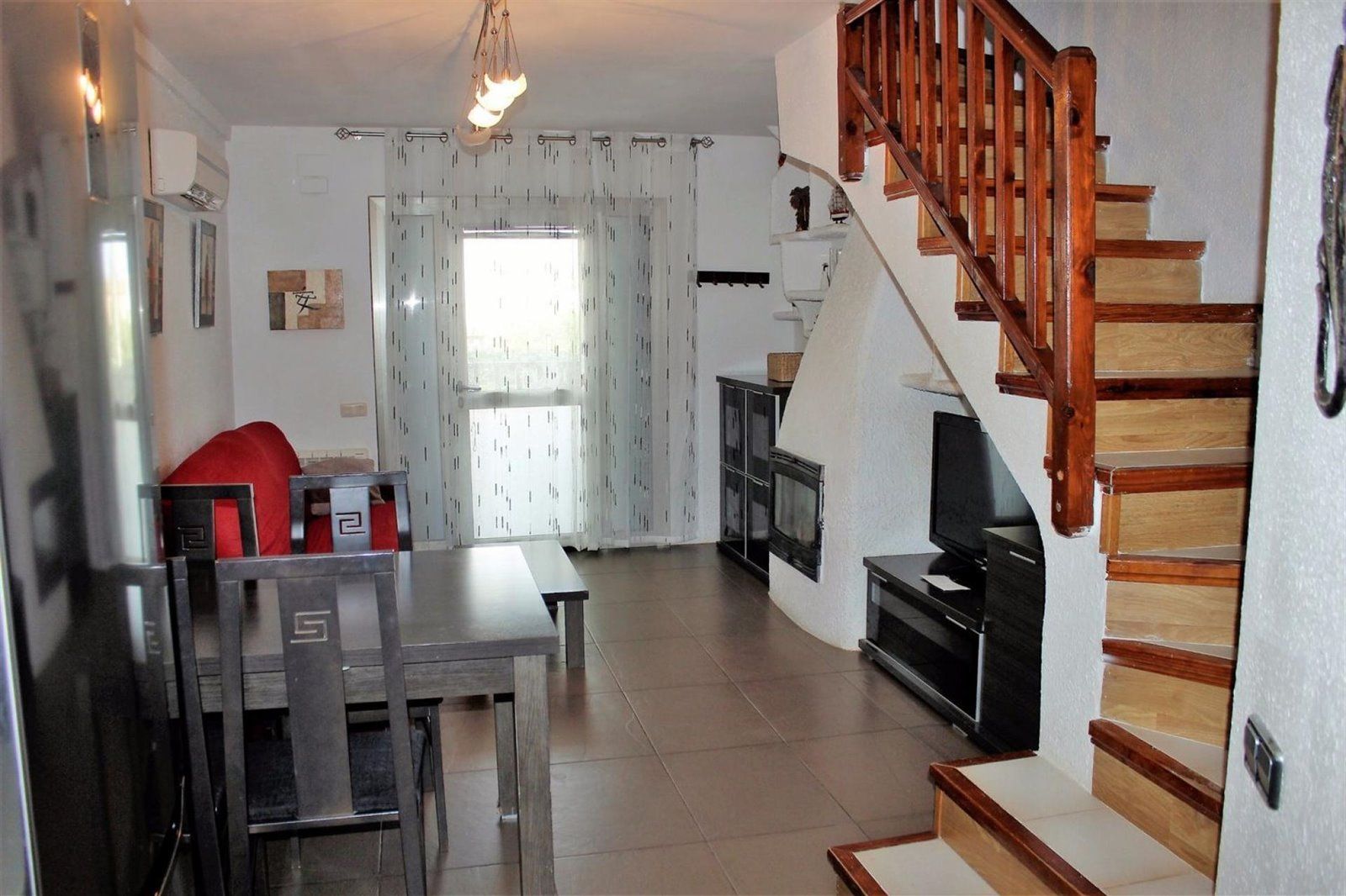 Preciosa casa adosada de estilo ibicenco en la urbanización Sant Jordi (Torredembarra), muy luminosa y lista para entrar a vivir. La vivienda dispone de 3 habitaciones, dos dobles y una individual, 1 baño completo y 1 aseo. Cuenta con suelo de gres, amplio salón-comedor con chimenea y cocina office de 16 m², totalmente equipada con nevera, lavadora, lavavajillas y microondas...Está equipada con aire acondicionado, calefacción eléctrica, cerramientos de doble acristalamiento, armarios empotrados, puerta de seguridad y antena parabólica comunitaria...En el exterior dispone de dos terrazas, una de 6 m² y otra de 10 m², ideal para colocar mesa con cuatro sillas y pérgola, perfectas para disfrutar del clima mediterráneo...Garaje con puerta automatizada para un coche...Ubicada en una cuidada urbanización con piscina y jardín comunitarios, en una zona tranquila y bien comunicada de Torredembarra, ideal tanto como residencia habitual como segunda vivienda...SE VENDE CON LICENCIA TURISTICA.